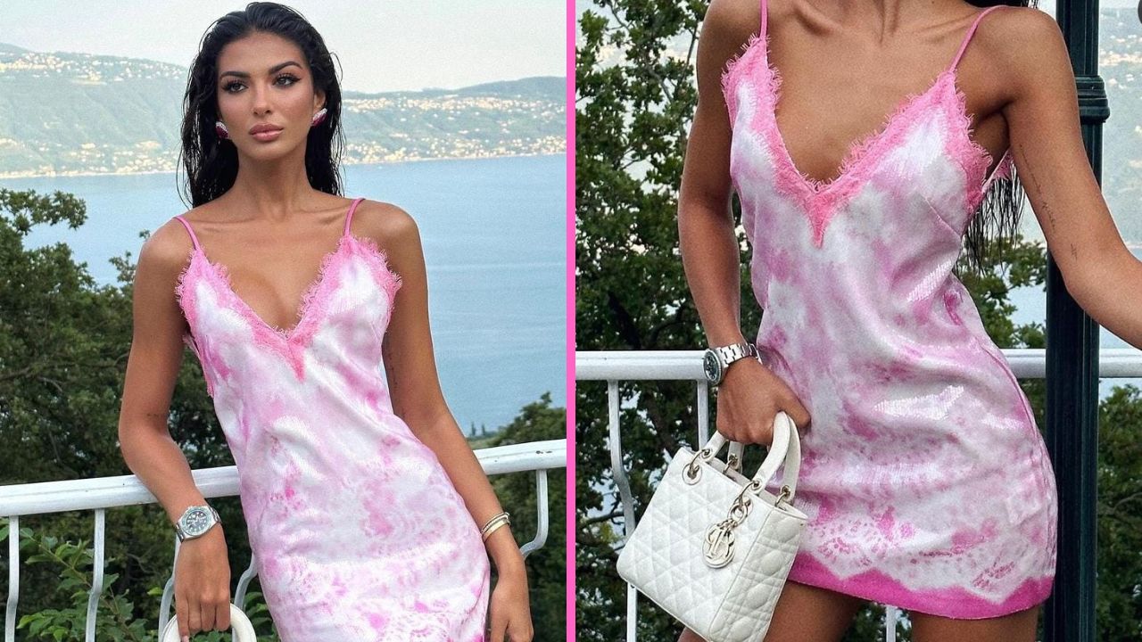 Elisa Maino, influencer da 3 milioni di follower solo su Instagram, ha scelto per una delle sue serate estive lo Slip Dress di MSGM. Un abito corto con scollo a V, spalline sottili e chiusura con zip laterale. È paillettes all-over, ed è decorato con toni che virano dal bianco al rosa Barbie. Su tutto l’abito, regna la stampa Trompe l’Oeil Lace, ed è arricchito da dettagli di pizzo rosa sul seno.