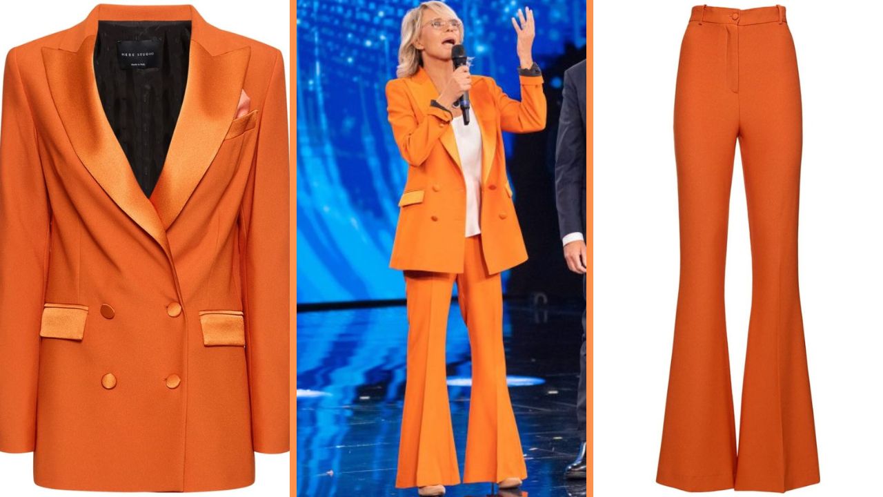 Maria, infatti, ha indossato un completo giacca e pantaloni color arancio, un vero punto di luce che brillava in mezzo agli altri. Il completo della super conduttrice, Hebe Studio, è costituito da blazer lungo e pantaloni. Il blazer ha una chiusura doppiopetto, con taschino e pochette da taschino inclusa, due tasche frontali con pattina e bottoni lucidi ton sur ton, per un prezzo di 550 euro. Completa il tailleur un paio di pantaloni dello stesso colore, dal taglio svasato a zampa di elefante, al costo di 290 euro. Questo completo è assolutamente strepitoso, perché è elegante e raffinato ma allo stesso tempo audace e trasgressivo, per chi non vuole passare inosservato.